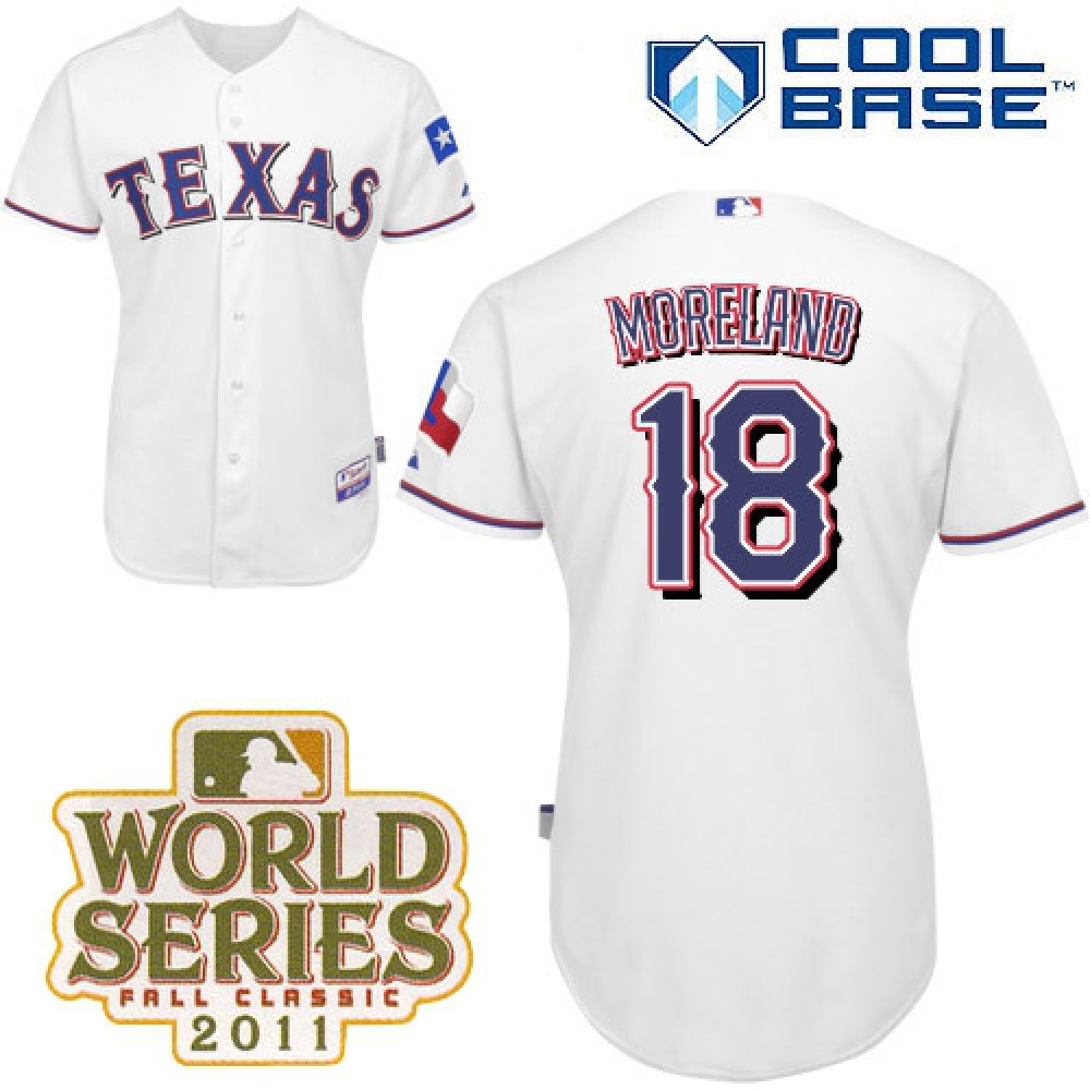 Rangers #18 Mitch Moreland White Cool Base 2011 World Series Patch Stitched MLB Jersey